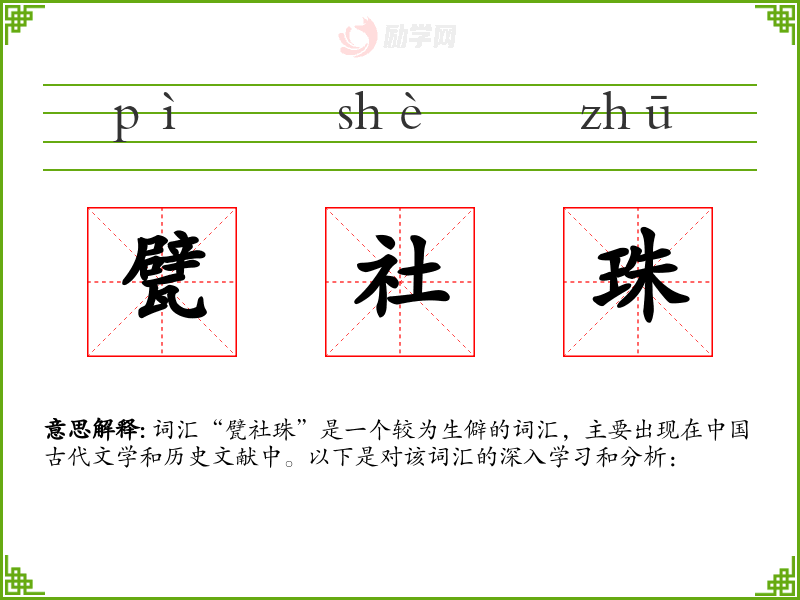 词汇“甓社珠”是一个较为生僻的词汇,主要出现在*古代文学和历史文献中。以下是对该词汇的深入学和分析: