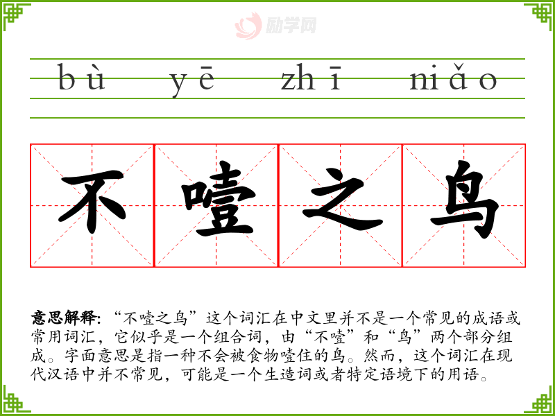 同义词:可能的同义词包括“无碍之鸟”、“无忧之鸟”,但这些词汇同样不常见。 反义词:反义词可能是“噎食之鸟”,但这个词汇同样不常见。