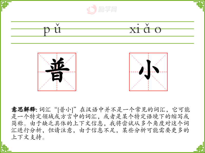 词汇“[普小]”在汉语中并不是一个常见的词汇,它可能是一个特定领域或方言中的词汇,或者是某个特定语境下的缩写或简称。由于缺乏具体的上下文信息,我将尝试从多个角度对这个词汇进行分析,但请注意,由于信息不足,某些分析可能需要更多的上下文支持。