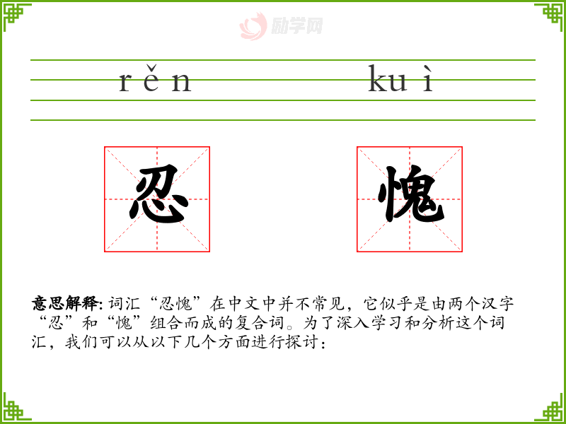 词汇“忍愧”在中文中并不常见,它似乎是由两个汉字“忍”和“愧”组合而成的复合词。为了深入学*和分析这个词汇,我们可以从以下几个方面进行探讨: