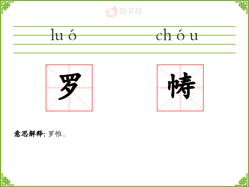 《说文》-罗,以丝罟鸟也。 《诗·王风·兔爰》-有兔爰爰,雉离于罗。 《韩非子·难三》-以天下为这罗,则雀不失矣。 曹植《野田黄雀行》-不见篱间雀,见鹞自投罗。