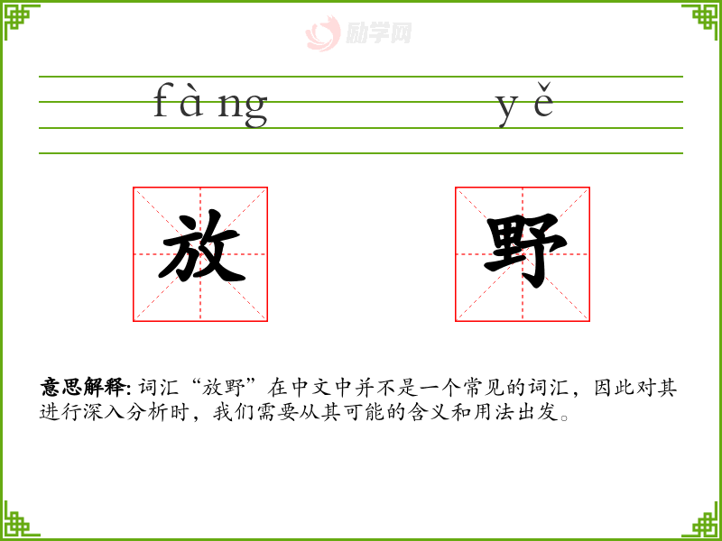 词汇“放野”在中文中并不是一个常见的词汇,因此对其进行深入分析时,我们需要从其可能的含义和用法出发。