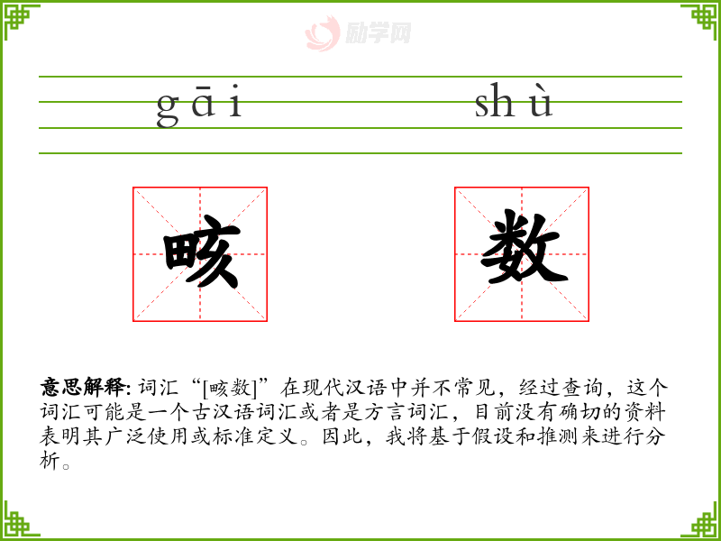 词汇“[畡数]”在现代汉语中并不常见,经过查询,这个词汇可能是一个古汉语词汇或者是方言词汇,目前没有确切的资料表明其广泛使用或标准定义。因此,我将基于假设和推测来进行分析。
