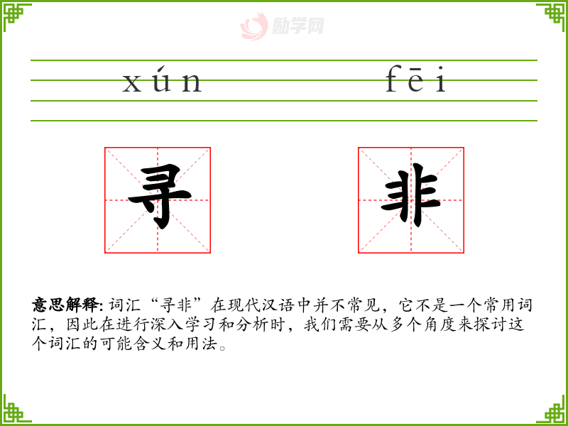 词汇“寻非”在现代汉语中并不常见,它不是一个常用词汇,因此在进行深入学习和分析时,我们需要从多个角度来探讨这个词汇的可能含义和用法。