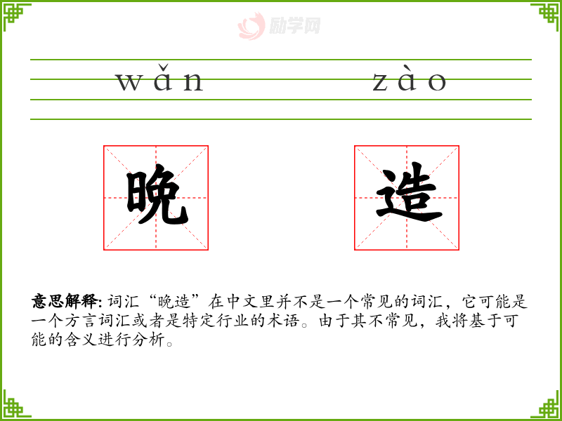 词汇“晚造”在中文里并不是一个常见的词汇,它可能是一个方言词汇或者是特定行业的术语。由于其不常见,我将基于可能的含义进行分析。