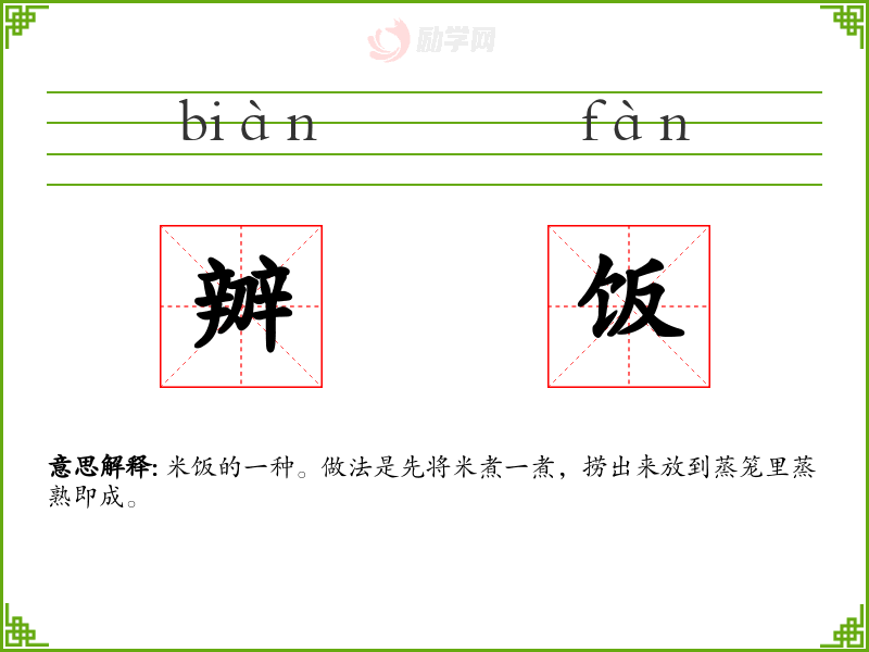 辧饭的意思是:米饭的一种。做法是先将米煮一煮,捞出来放到蒸笼里蒸熟即成。