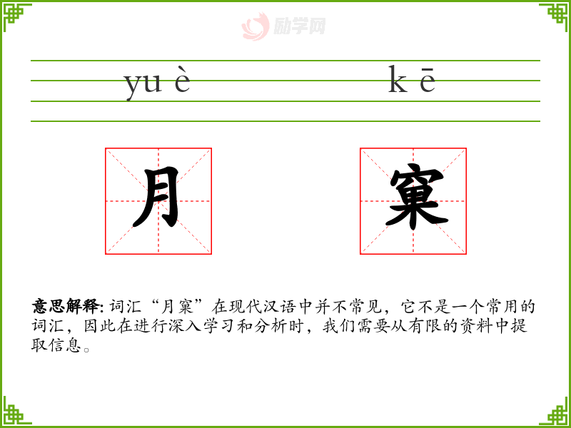 词汇“月窠”在现代汉语中并不常见,它不是一个常用的词汇,因此在进行深入学*和分析时,我们需要从有限的资料中提取信息。