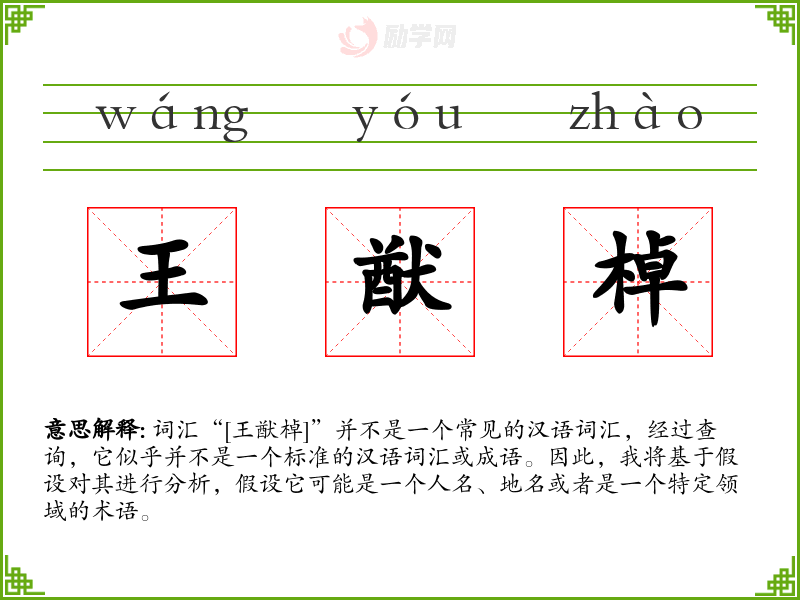 词汇“[王猷棹]”并不是一个常见的汉语词汇,经过查询,它似乎并不是一个标准的汉语词汇或成语。因此,我将基于假设对其进行分析,假设它可能是一个人名、地名或者是一个特定领域的术语。