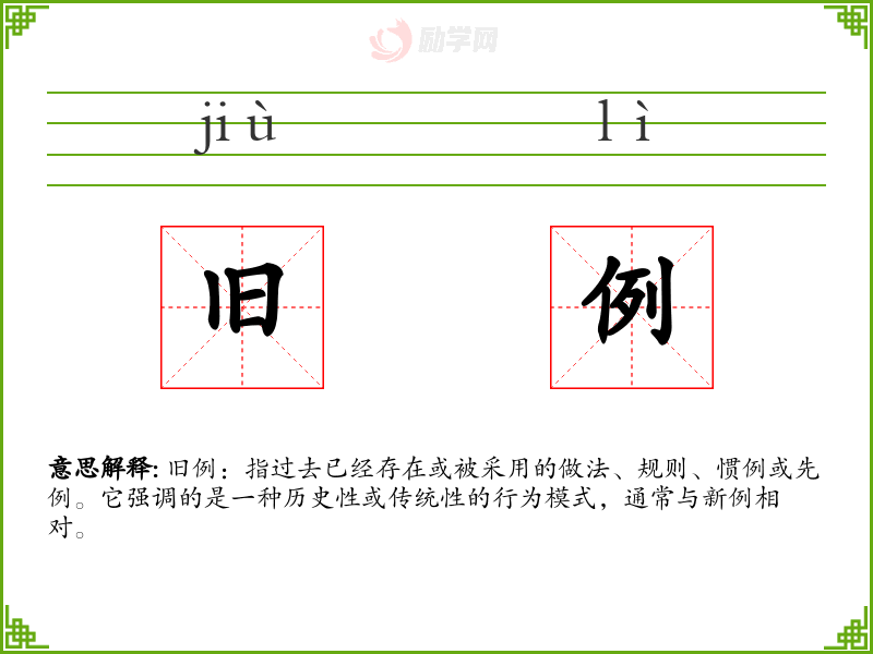 - 专业领域:在法律或历史学中,旧例指的是先前的判例或历史**,如“这个案件的判决遵循了旧例。”