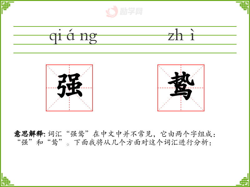 - 词源:“强”和“鸷”都是古汉语词汇,有着悠久的历史。