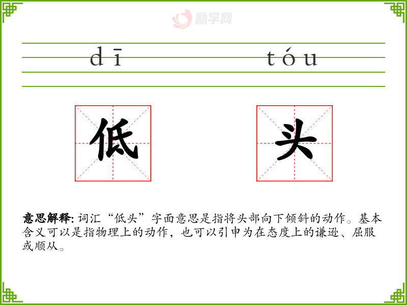 词汇“低头”字面意思是指将头部向下倾斜的动作。基本含义可以是指物理上的动作,也可以引申为在态度上的谦逊、屈服或顺从。