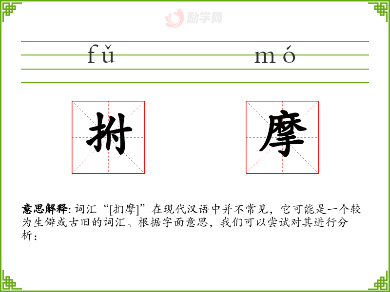 词汇“[扪摩]”在现代汉语中并不常见,它可能是一个较为生僻或古旧的词汇。根据字面意思,我们可以尝试对其进行分析: