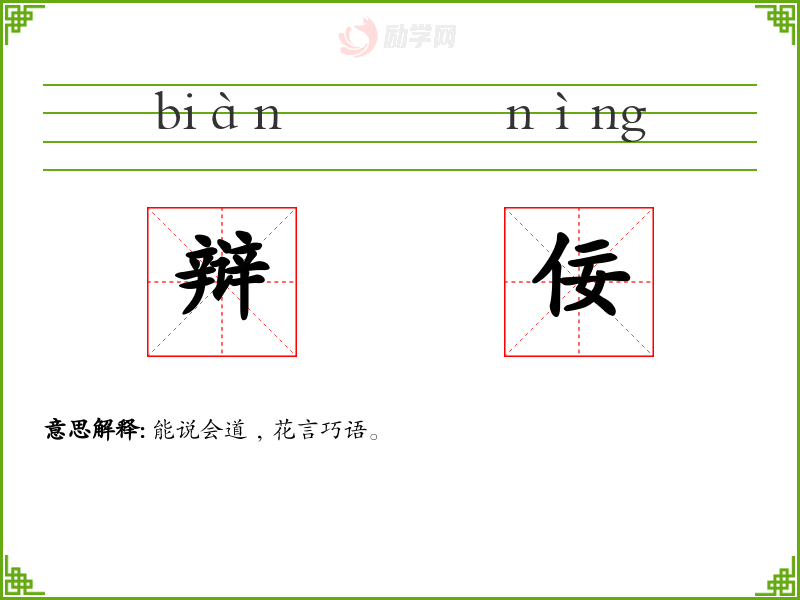 《说文》-佞,巧谄高材也。 《广雅》-佞,巧也。 《韩诗外传》-佞,谄也。 《国语·晋语》-佞之见佞,果丧其田。 《史记·周本纪》-为人佞巧。 《盐铁论·刺议》-以邪导人谓之佞。 《论语·公冶长》-焉用佞。 《书·吕刑》-非佞折狱,惟良折狱。 唐·柳宗元《答韦中立论师道书》-非佞誉诬谀之徒。