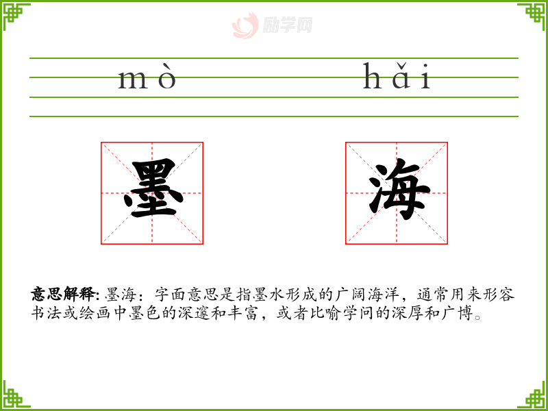 - 文学:在文学作品中,“墨海”常用来形容文人的学识渊博,如“他的学问如同墨海一般深不可测”。