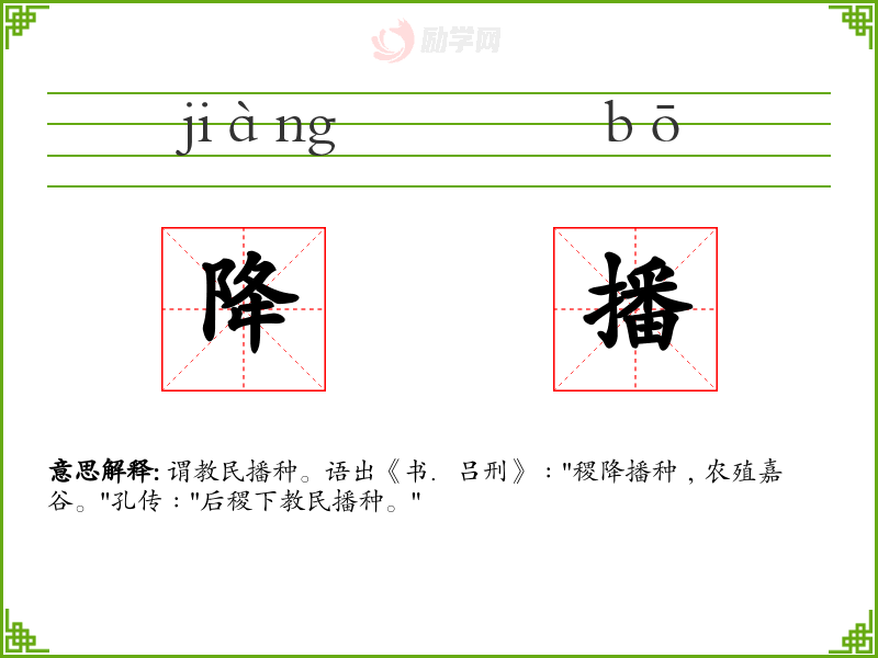 降播的意思是:谓教民播种。语出《书.吕刑》﹕"稷降播种﹐农殖嘉谷。"孔传﹕"后稷下教民播种。"