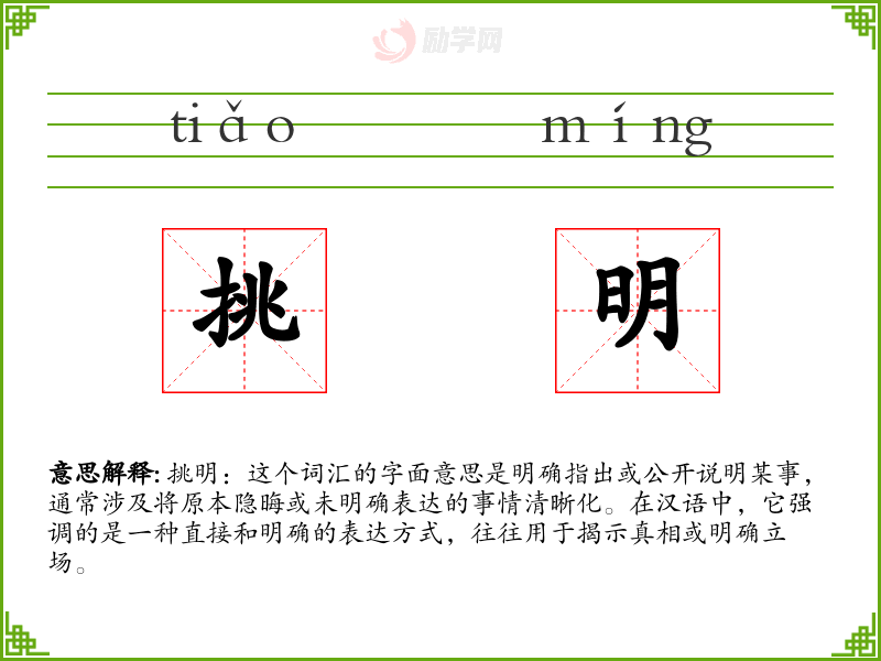 挑明:这个词汇的字面意思是明确指出或公开说明某事,通常涉及将原本隐晦或未明确表达的事情清晰化。在汉语中,它强调的是一种直接和明确的表达方式,往往用于揭示真相或明确立场。