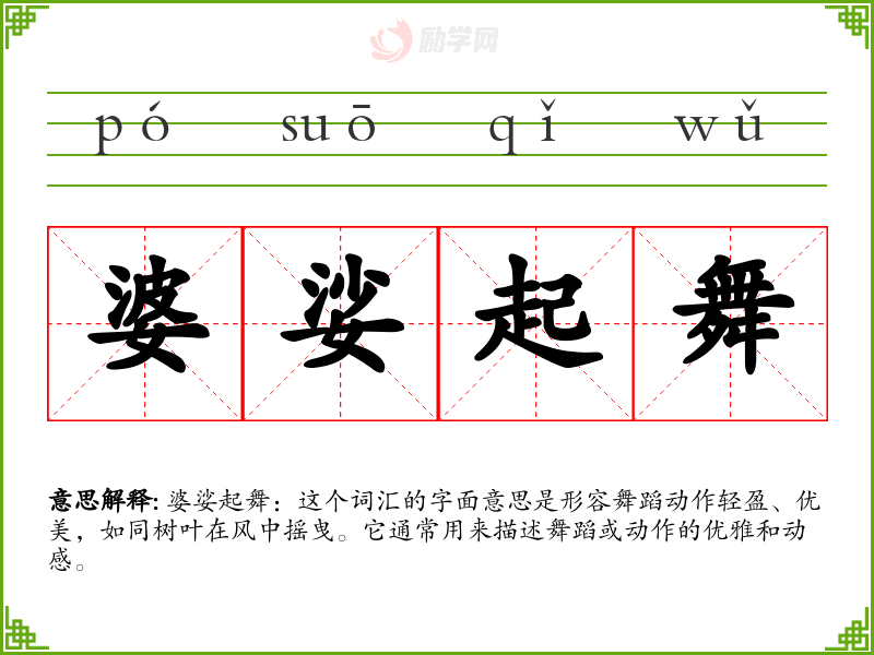 婆娑起舞:这个词汇的字面意思是形容舞蹈动作轻盈、优美,如同树叶在风中摇曳。它通常用来描述舞蹈或动作的优雅和动感。