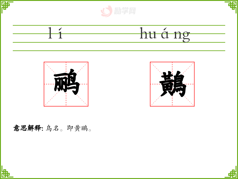 鹂[ lí ] 1. ——“黄鹂”(huánglí):也叫“黄茑”。羽毛黄色,从眼部到头后部有黑色斑纹。 [更多解释]