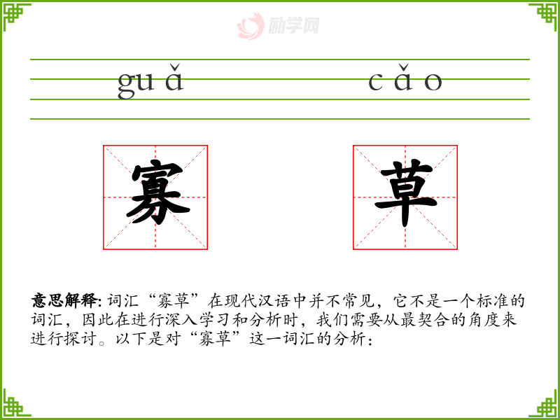 词汇“寡草”在现代汉语中并不常见,它不是一个标准的词汇,因此在进行深入学习和分析时,我们需要从最契合的角度来进行探讨。以下是对“寡草”这一词汇的分析: