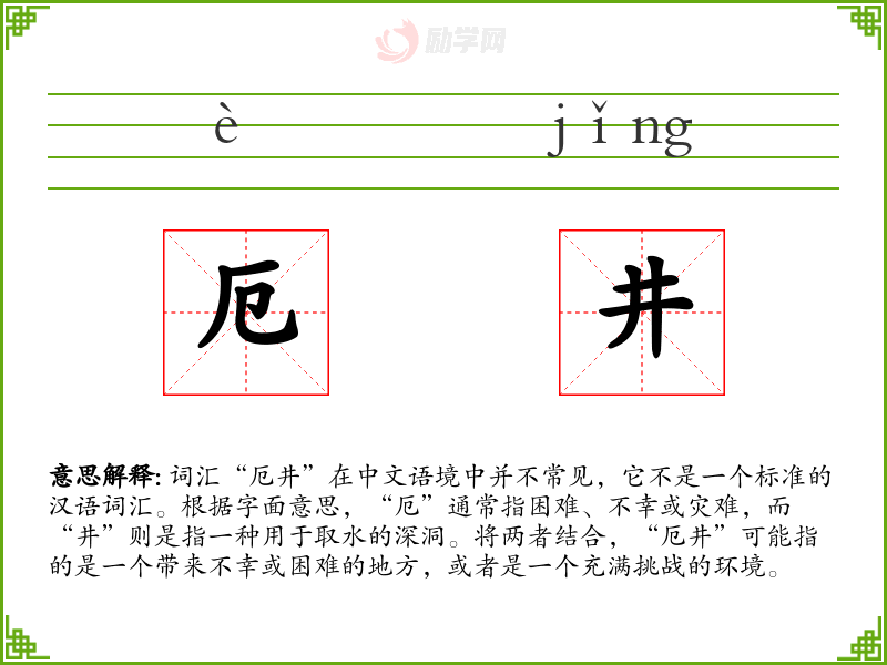 由于“厄井”不是一个常用词汇,它在文学、口语或专业领域中的使用非常有限。可能在一些特定的文学作品或比喻性的表达中出现,用来形容一个极其困难或危险的情况。