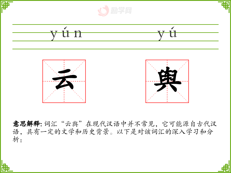 词汇“云舆”在现代汉语中并不常见,它可能源自古代汉语,具有一定的文学和历史背景。以下是对该词汇的深入学*和分析: