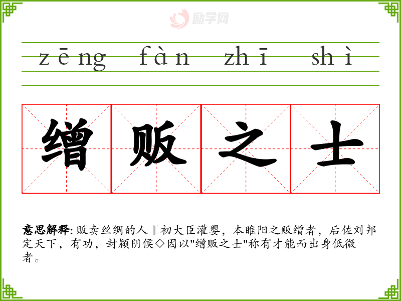 缯贩之士的意思是:贩卖丝绸的人『初大臣灌婴,本睢阳之贩缯者,后佐刘邦定天下,有功,封颍阴侯◇因以"缯贩之士"称有才能而出身低微者。
