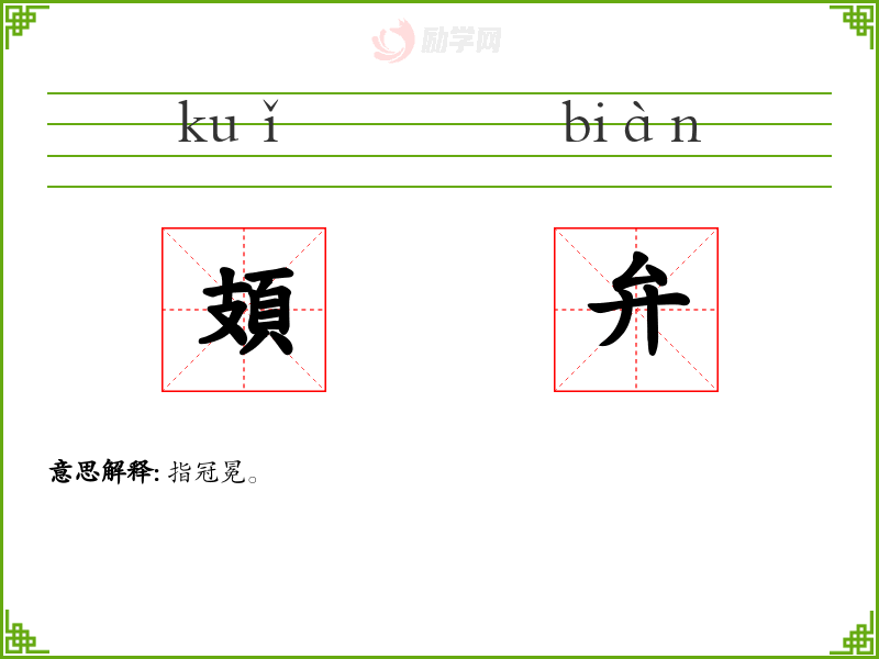《说文》。俗作卞。凡大夫以上服冕,士弁,制如冕爵。-覍,冠也。周曰覍,殷曰吁,夏曰收。 《周礼·弁师》注-弁者,古冠之大称。委貌缁布曰冠。 《仪礼·士冠礼》。服注:“以白鹿皮为冠。”-皮弁。 《广韵》-弁,周冠名。 《诗·小雅·甫田》-突而弁兮。 《书·金縢》。传:“弁,皮弁。”-王与大夫尽弁。 《左传·襄公二十五年》-不说(tuō,脱掉)弁而死于崔氏。
