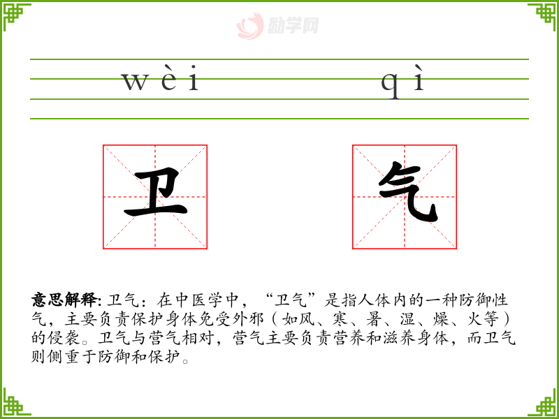 卫气:在中医学中,“卫气”是指人体内的一种防御性气,主要负责保护身体免受外邪(如风、寒、暑、湿、燥、火等)的侵袭。卫气与营气相对,营气主要负责营养和滋养身体,而卫气则侧重于防御和保护。