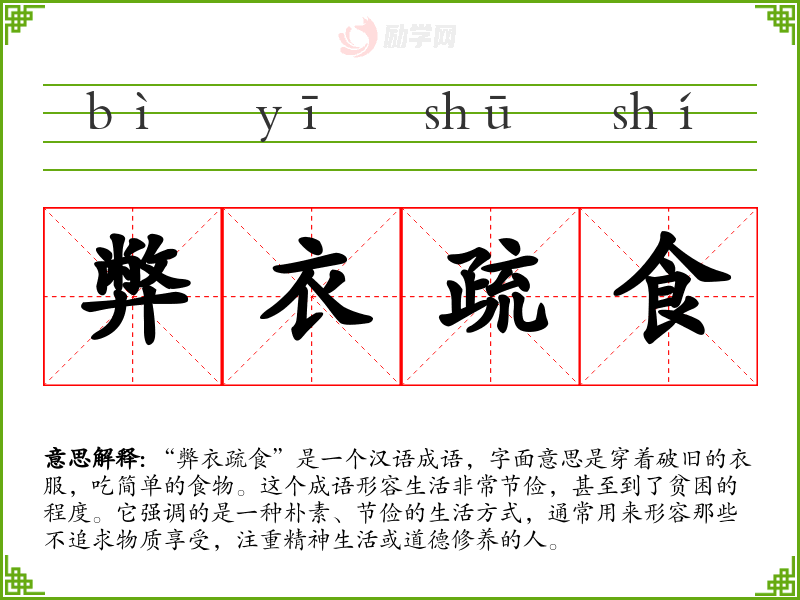 在文学作品中,“弊衣疏食”常用来描绘那些清贫但品德高尚的人物形象,如古代的隐士、学者或忠诚的官员。在口语中,这个成语可能用来形容某人的生活简朴,或者在讨论节俭的生活方式时提及。在专业领域,如经济学或社会学,这个词汇可能用来讨论贫困问题或节俭行为的社会影响。