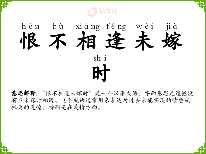 “恨不相逢未嫁时”是一个汉语成语,字面意思是遗憾没有在未嫁时相遇。这个成语通常用来表达对过去未能实现的情感或机会的遗憾,特别是在爱情方面。