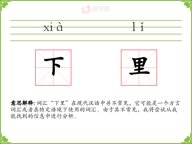 词汇“下里”在现代汉语中并不常见,它可能是一个方言词汇或者在特定语境下使用的词汇。由于其不常见,我将尝试从我能找到的信息中进行分析。