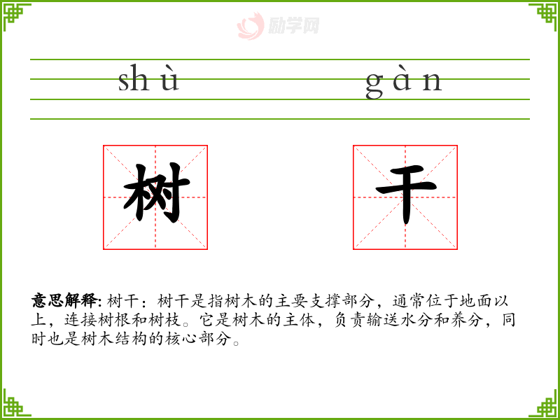 - 反义词:树枝、树叶(这些词汇与树干形成对比,分别指树木的不同部分)