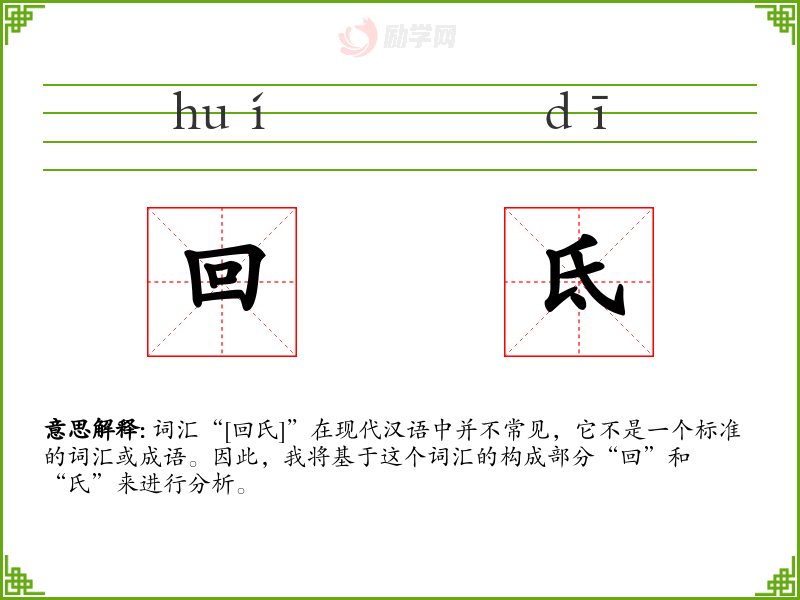 “回氏”不是一个常用或标准的汉语词汇,它的使用非常有限。在学*和使用汉语时,更应关注常用和标准的词汇和表达方式。