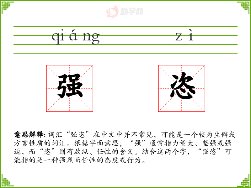 - 文学:在文学作品中,“强恣”可能用来形容一个角色的性格特点,如《红楼梦》中的某些角色可能被描述为“强恣”。