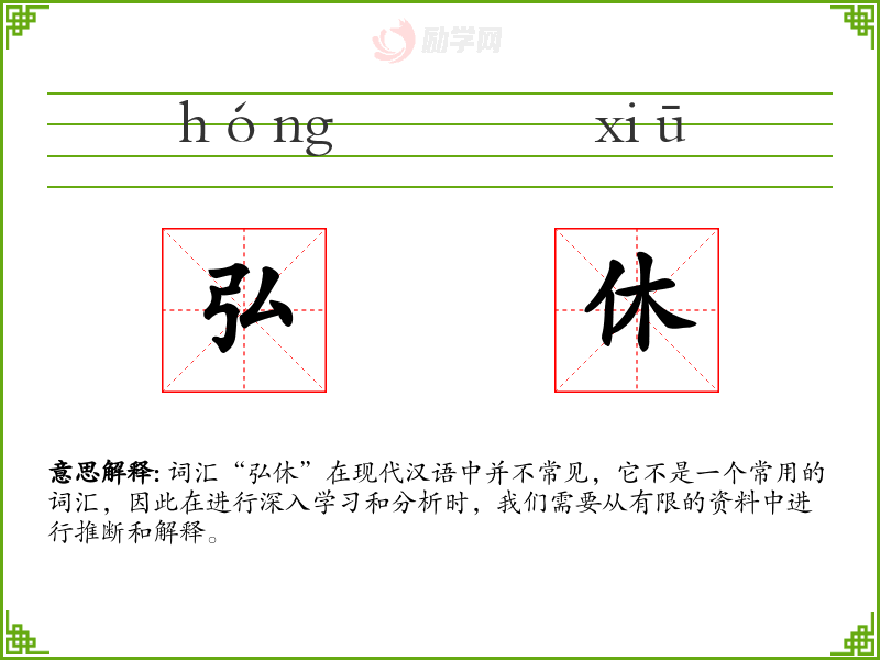 词汇“弘休”在现代汉语中并不常见,它不是一个常用的词汇,因此在进行深入学*和分析时,我们需要从有限的资料中进行推断和解释。