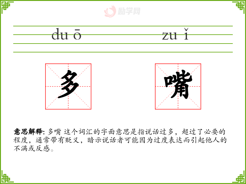 多嘴 这个词汇的字面意思是指说话过多,超过了必要的程度,通常带有贬义,暗示说话者可能因为过度表达而引起他人的不满或反感。