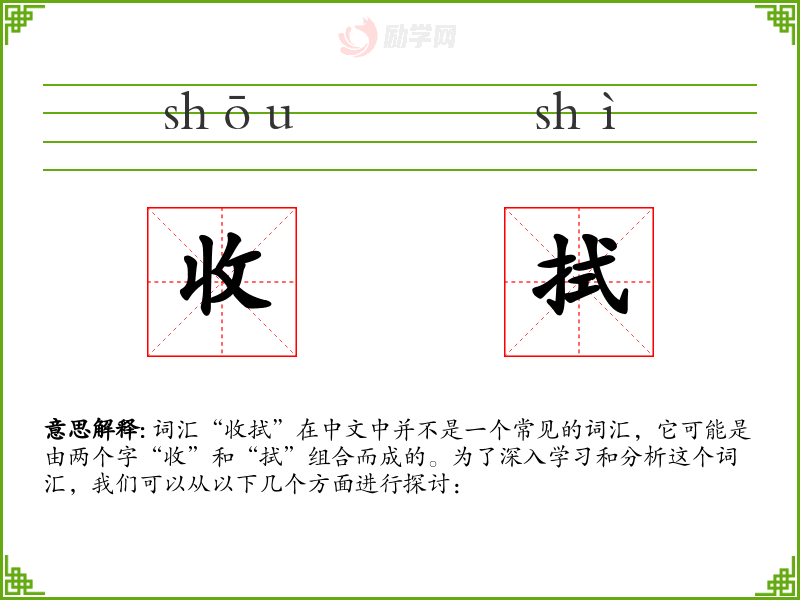 词汇“收拭”在中文中并不是一个常见的词汇,它可能是由两个字“收”和“拭”组合而成的。为了深入学习和分析这个词汇,我们可以从以下几个方面进行探讨: