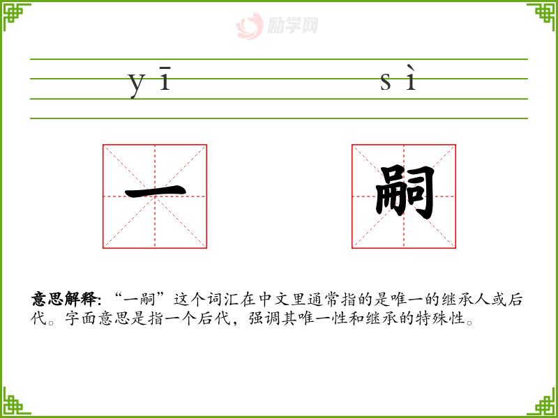 “一嗣”这个词汇在中文中承载了丰富的文化和情感内涵,它不仅仅是一个简单的词汇,更是家族传承和责任的象征。在语言学*和表达中,理解和正确使用这个词汇,可以帮助我们更好地把握和传达与家族、继承相关的复杂情感和责任。
