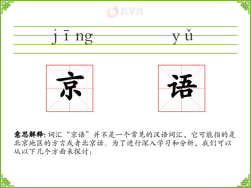 词汇“京语”并不是一个常见的汉语词汇,它可能指的是北京地区的方言或者北京话。为了进行深入学*和分析,我们可以从以下几个方面来探讨:
