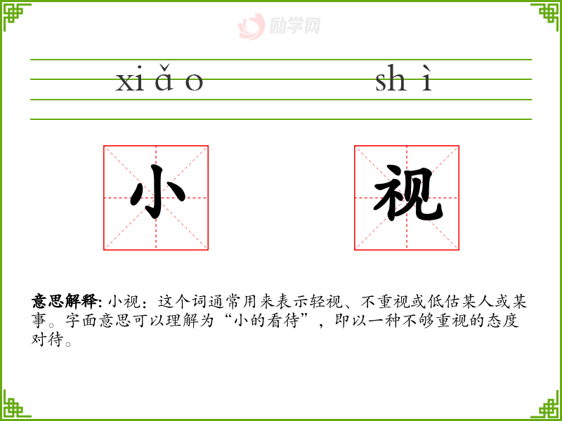 小视:这个词通常用来表示轻视、不重视或低估某人或某事。字面意思可以理解为“小的看待”,即以一种不够重视的态度对待。