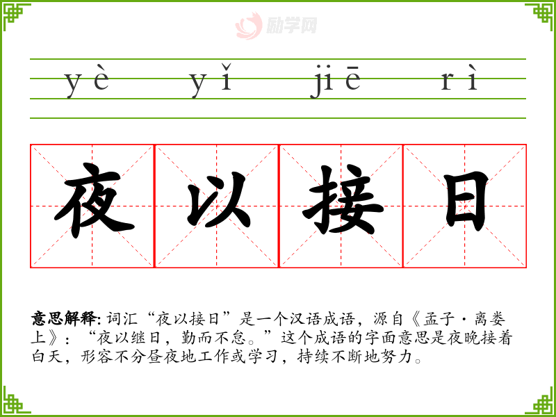 “夜以接日”源自《孟子·离娄上》,原文是“夜以继日,勤而不怠”,后来逐渐演变成现在的成语形式,用来形容人的勤奋和不懈努力。