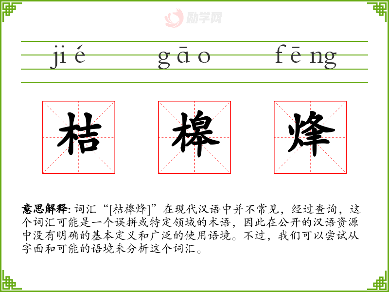 由于“桔槔烽”不是一个标准的汉语词汇,我们无法给出确切的基本定义。但从字面上看,“桔”可能指柑橘类水果,“槔”是一个较少见的字,可能与某种工具或结构有关,“烽”通常指古代用于传递警报的烽火。