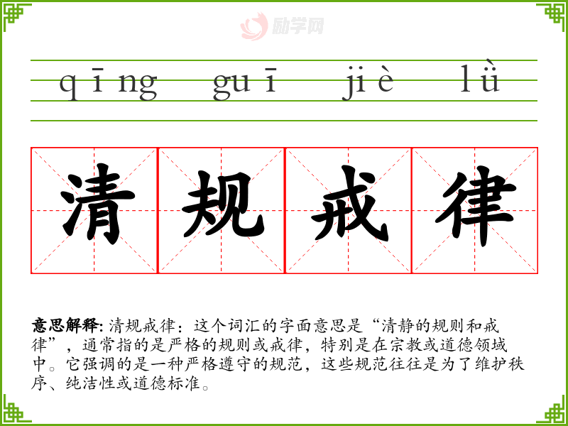 清规戒律:这个词汇的字面意思是“清静的规则和戒律”,通常指的是严格的规则或戒律,特别是在**或道德领域中。它强调的是一种严格遵守的规范,这些规范往往是为了维护秩序、纯洁性或道德标准。