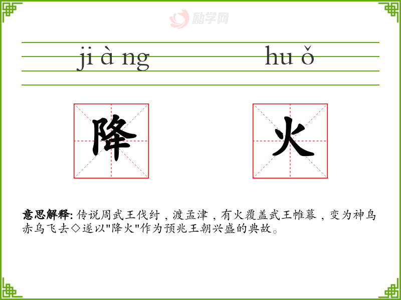 降火的意思是:传说周武王伐纣﹐渡孟津﹐有火覆盖武王帷幕﹐变为神鸟赤乌飞去◇遂以"降火"作为预兆王朝兴盛的典故。
