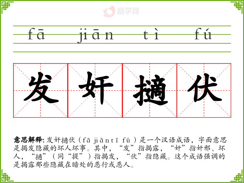 发奸擿伏(fā jiān tī fú)是一个汉语成语,字面意思是揭发隐藏的坏人坏事。其中,“发”指揭露,“奸”指奸邪、坏人,“擿”(同“提”)指揭发,“伏”指隐藏。这个成语强调的是揭露那些隐藏在暗处的恶行或恶人。