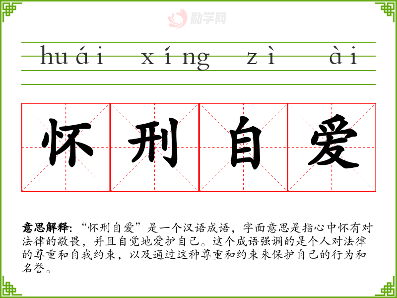 “怀刑自爱”是一个汉语成语,字面意思是指心中怀有对法律的敬畏,并且自觉地爱护自己。这个成语强调的是个人对法律的尊重和自我约束,以及通过这种尊重和约束来保护自己的行为和名誉。