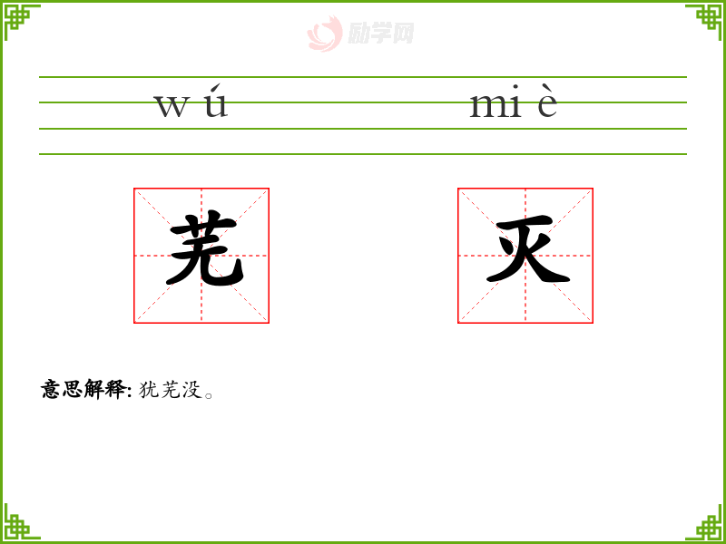 《说文》-灭,尽也。 《尔雅·释诂》-灭,绝也。 《礼记·乐记》-国之灭亡无日矣。 《谷梁传·襄公六年》-家有既亡,国有既灭。 《吕氏春秋·情势》-以小畜大灭。 杜牧《阿房宫赋》-谁得而族灭也? 苏洵《六国论》-六国破灭,非兵不利,战不善,敝在赂秦。 《文心雕龙·明诗》-秦皇灭典,亦造仙诗 《战国策·魏策》-灭韩亡魏。