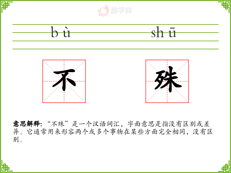 “不殊”由“不”和“殊”两个字组成。“不”表示否定,“殊”原意为不同或特别。在古代汉语中,“殊”也常用来表示死亡,如“殊死”。随着语言的发展,“不殊”逐渐演变为表示无差异的词汇。