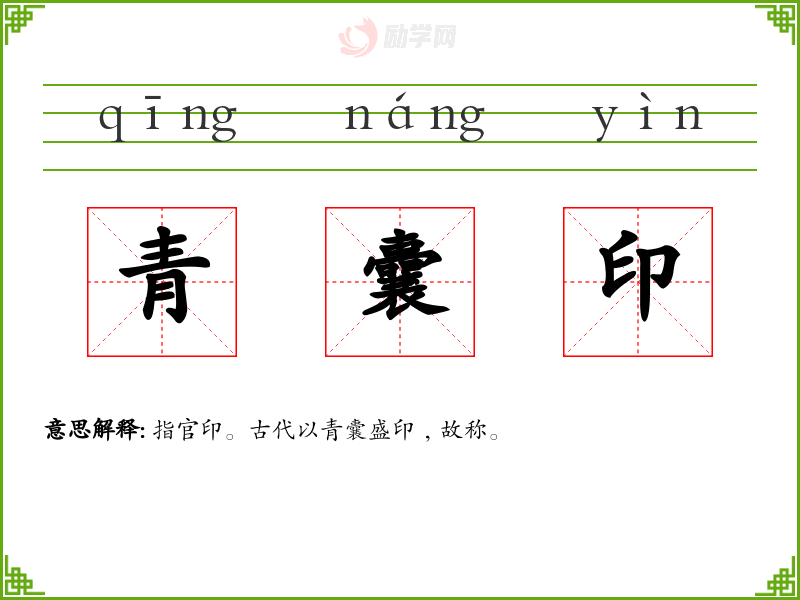 青囊印的意思是:指官印。古代以青囊盛印﹐故称。