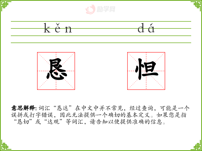词汇“恳达”在中文中并不常见,经过查询,可能是一个误拼或打字错误,因此无法提供一个确切的基本定义。如果您是指“恳切”或“达观”等词汇,请告知以便提供准确的信息。